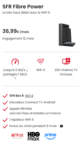 Destinée aux familles et aux foyers où les usages numériques sont plus intensifs, l’offre SFR Fibre Power représente la solution intermédiaire de la gamme. Elle est proposée à 36,99 € par mois avec un engagement de 12 mois, et son tarif est également fixe, sans augmentation au-delà de la première année.
